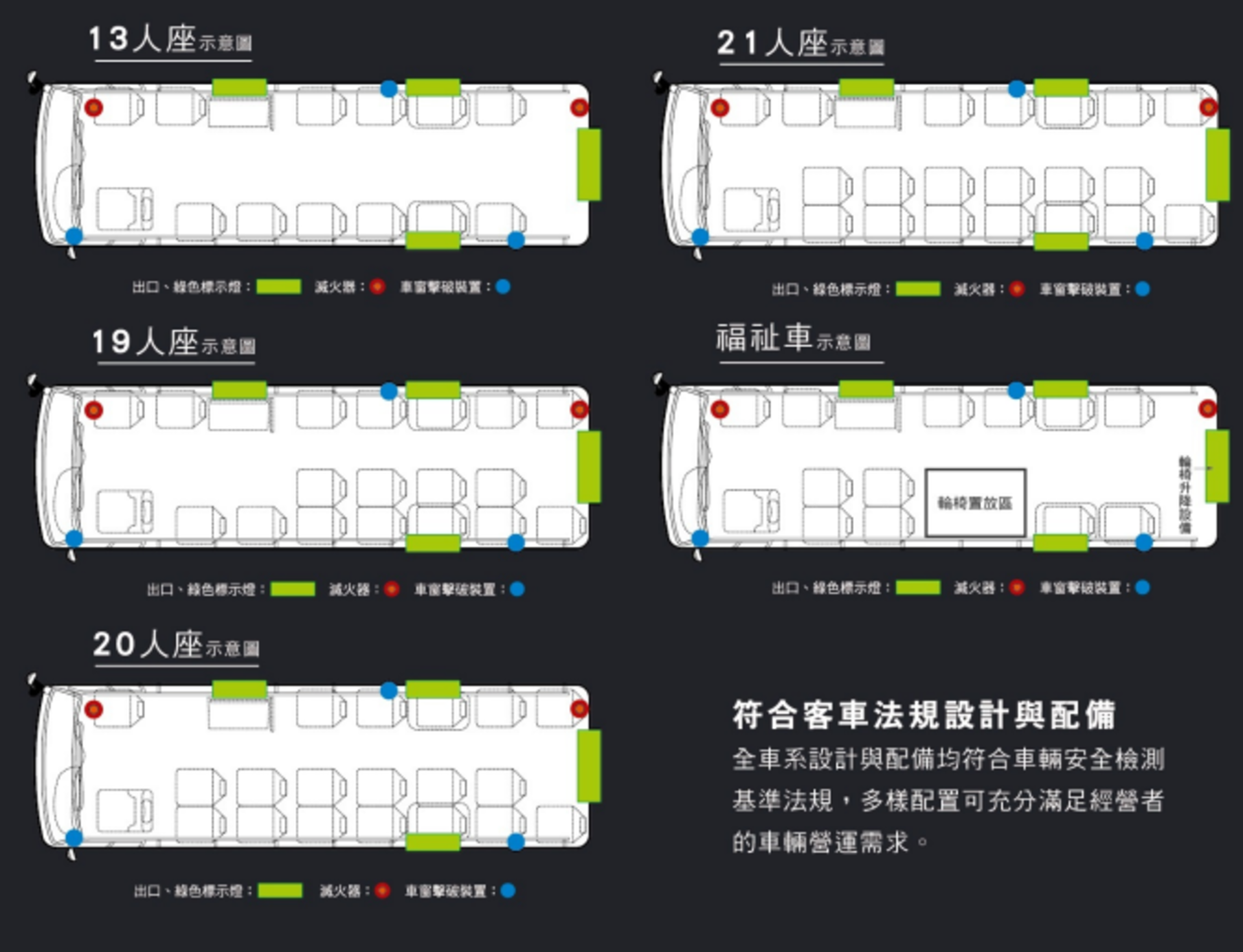 全車系設計與配備均符合車輛安全檢測基準法規,多樣配置可充分滿足經營者的車輛營運需求。