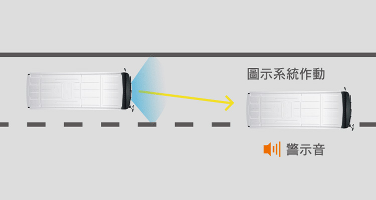 透過車輛前方所搭載的攝影機隨時偵測前方車道線,當行駛中車輛偏離車道時,系統將會發出警示音以提醒駕駛者注意。