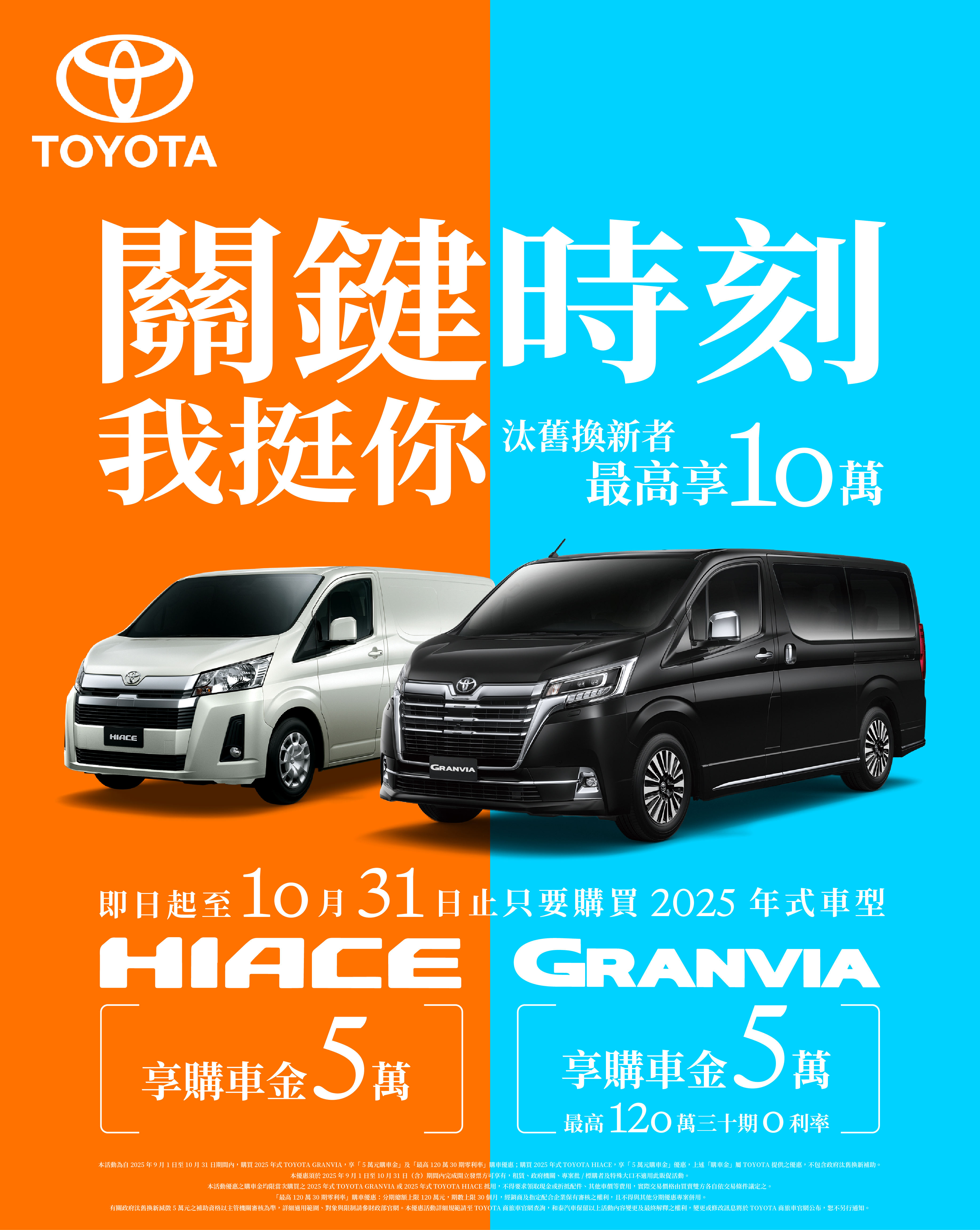 2.本活動對象:限購買2025年式TOYOTA GRANVIA及2025年式TOYOTA HIACE車型適用;不適用租賃、政府機關、專案批 / 標購者及特殊大口。