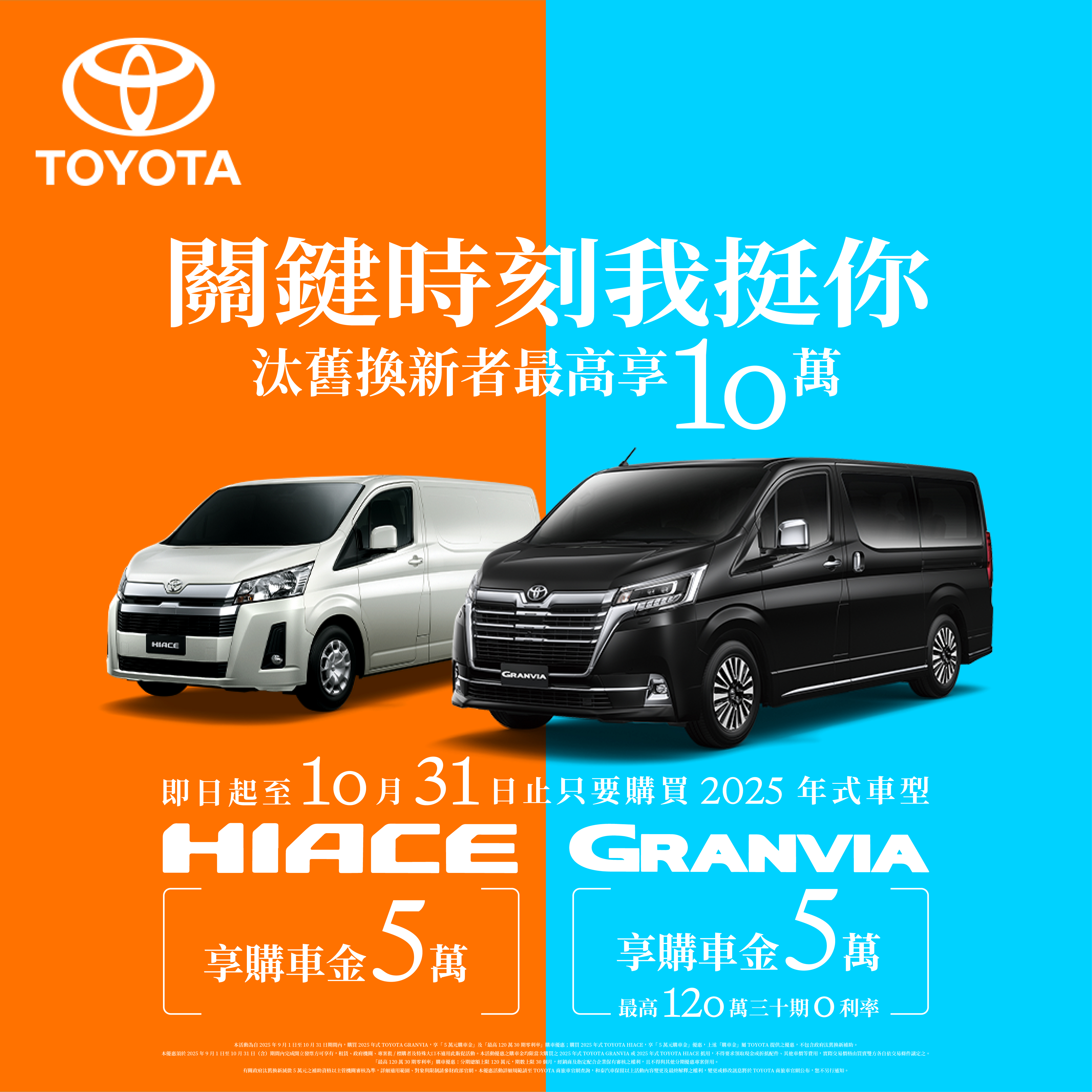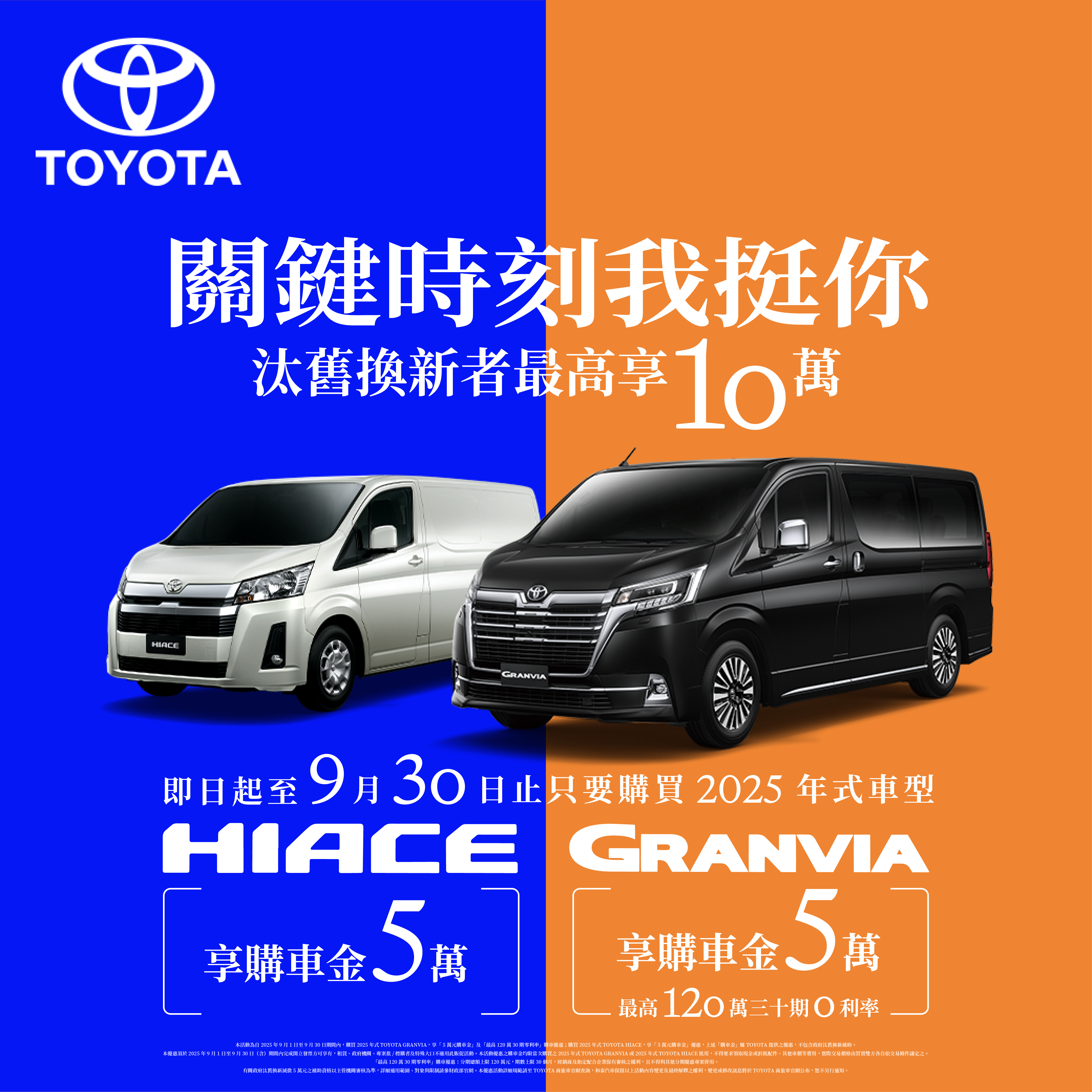 「關鍵時刻我挺你」好評持續!買GRANVIA、HIACE 享5萬購車金,GRANVIA再享零利率優惠