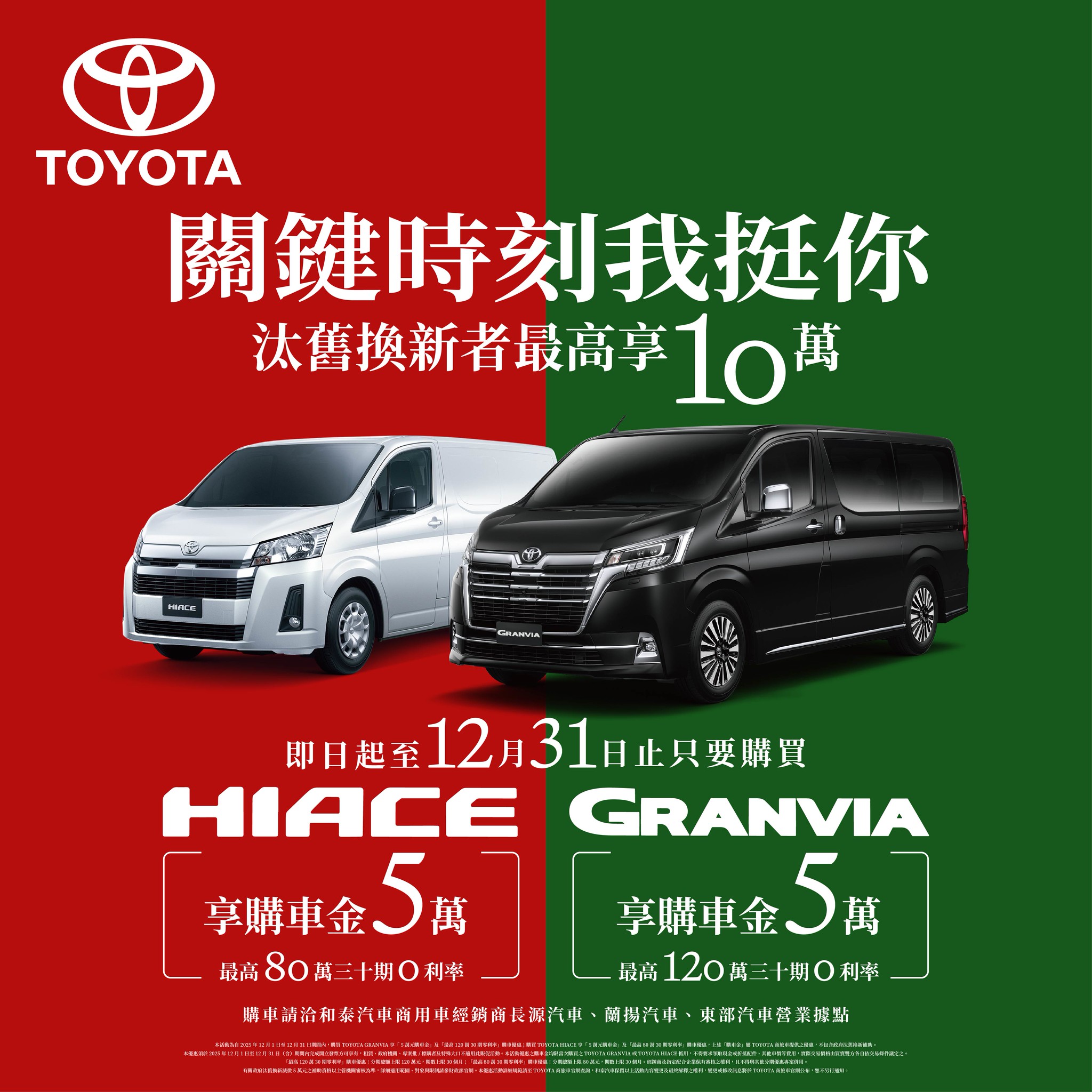 12月入主 GRANVIA、HIACE 享5萬元購車金,再享高額零利率購車優惠!